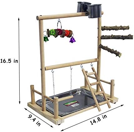 Package includes all the parts of bird stand, screws, a tray, ladder, swing, chewing toy and feeding cups. High quality wood bar,screws connection make it totally safe for your birds, give your birds more space to train.